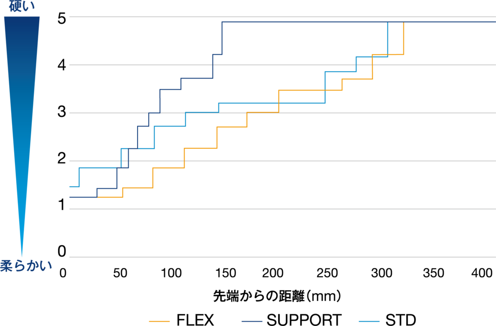 先端15cm以降は硬くすることでサポート性プッシャビリティを実現しています。